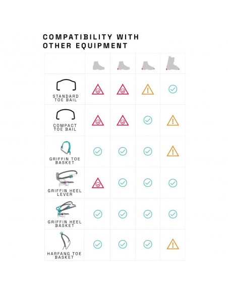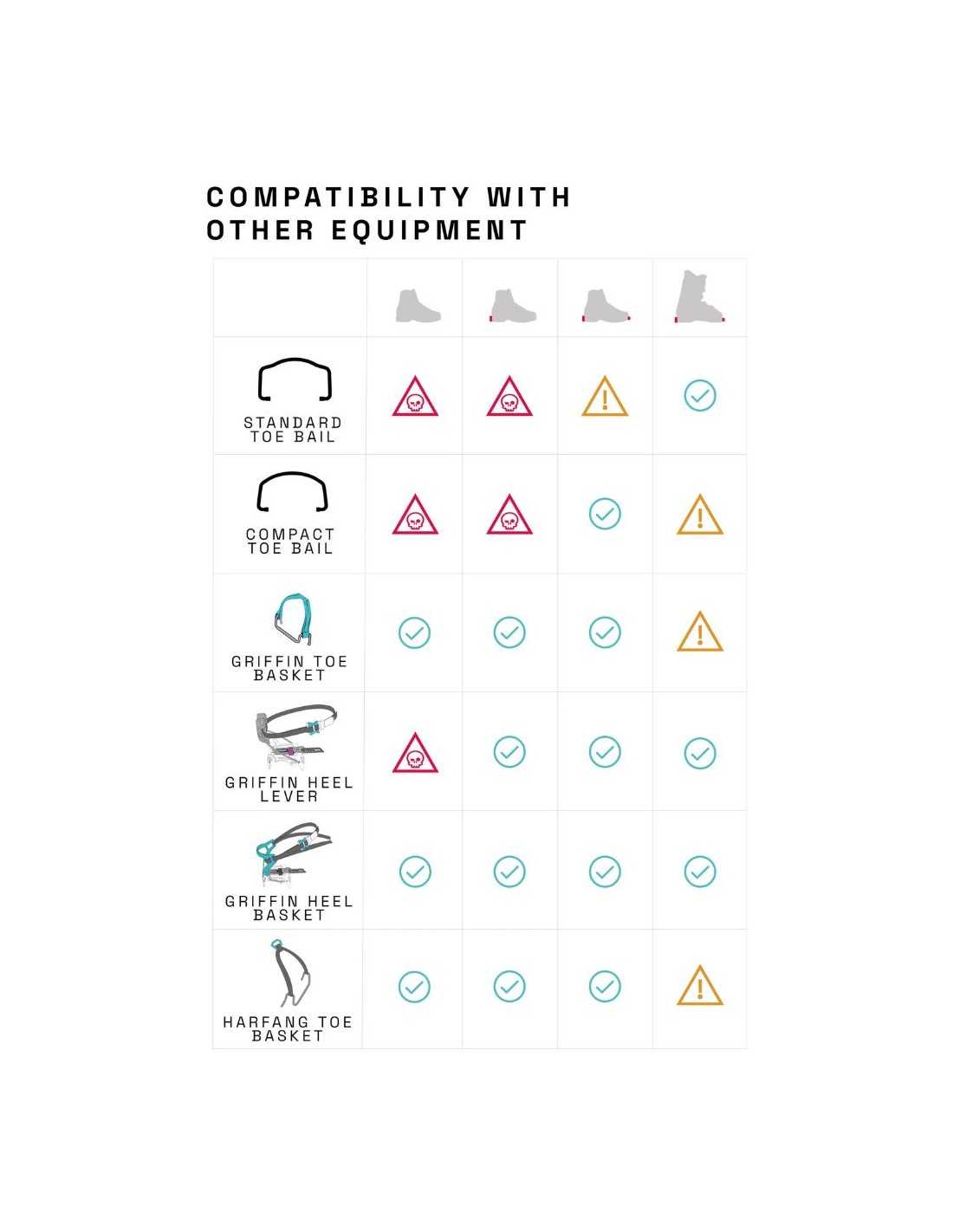 Su armazón de acero Cromoly de 2 mm, junto con rieles frontales y traseros en diseño 3D, posibilita una penetración eficiente en nieve y hielo. El sistema de ajuste universal por correas permite fijación segura, y el cierre trasero con microajuste proporciona precisión y ajuste fino. Dispone también de ABS delantero y trasero para evitar acumulaciones de nieve, y se entrega con bolsa de transporte.