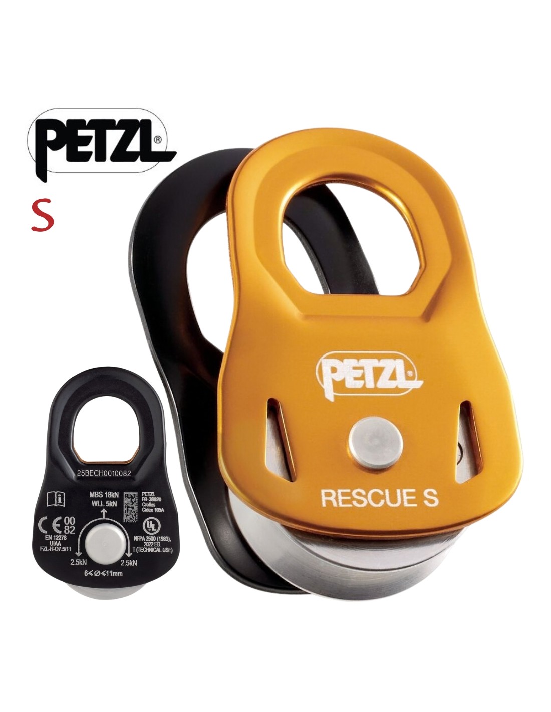 La polea RESCUE S es compacta, ligera y asegura un rendimiento elevado gracias a su roldana de aluminio montada sobre rodamiento de bolas estanco.