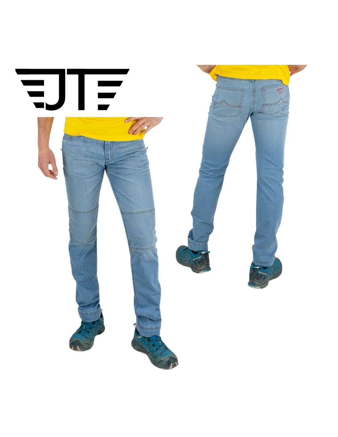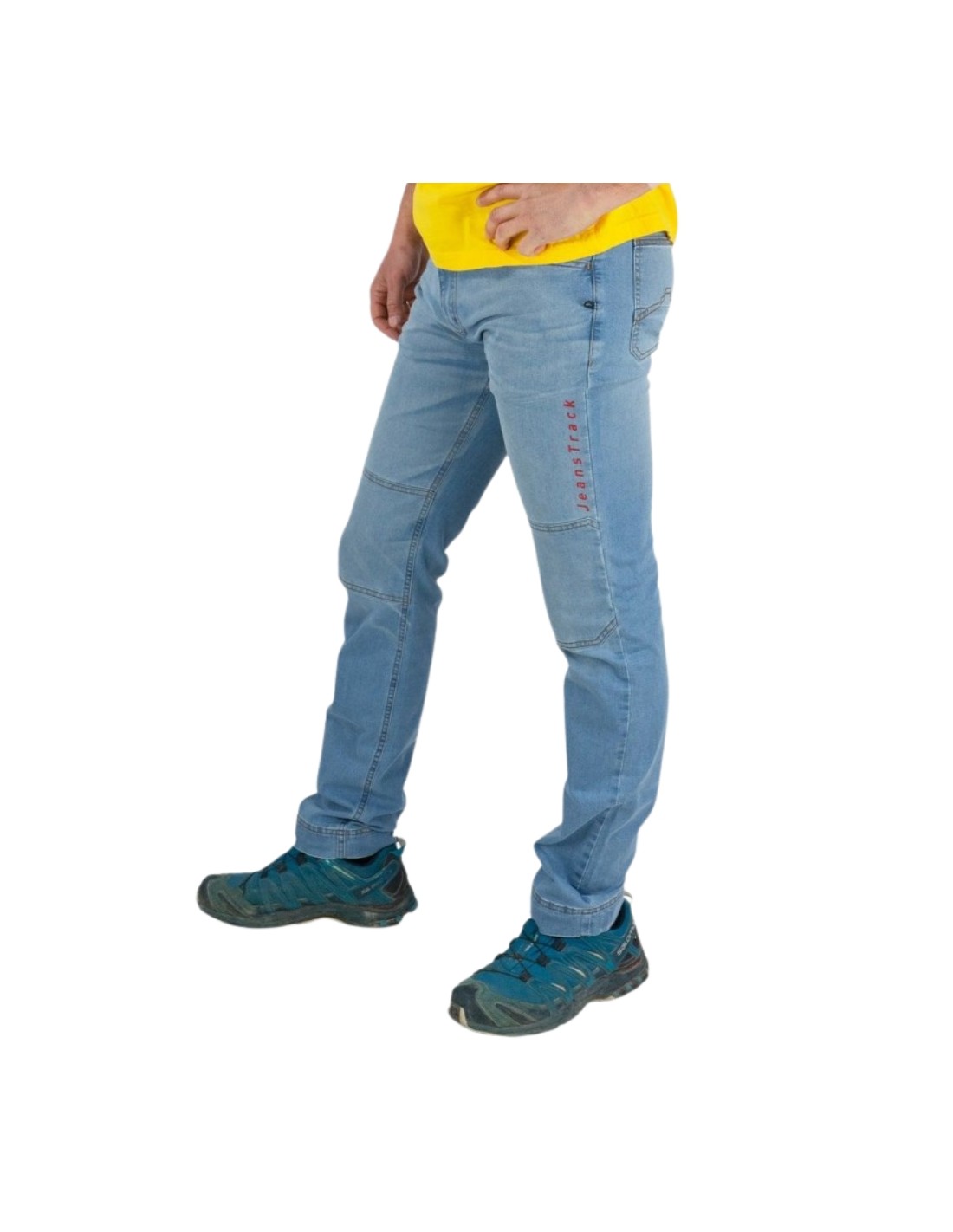 El Roca Jeans Riolita de Jeanstrack es un pantalón técnico diseñado para actividades de escalada, trekking y uso diario. Fabricado con una mezcla de algodón, Coolmax® y Lycra®, ofrece elasticidad, transpirabilidad y resistencia, adaptándose a los movimientos del cuerpo y proporcionando comodidad durante la actividad física.