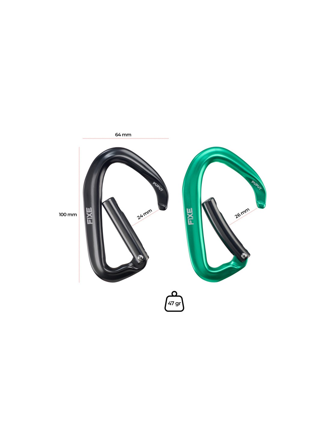 - Tamaño versátil: Sus proporciones ofrecen una gran maniobrabilidad para todo tipo de situaciones en la pared. Con 100 mm de alto, 64 mm de ancho, 24 mm y 26 mm de rango de apertura en sus versiones recta y curva respectivamente. Fabricado en aluminio 7075.