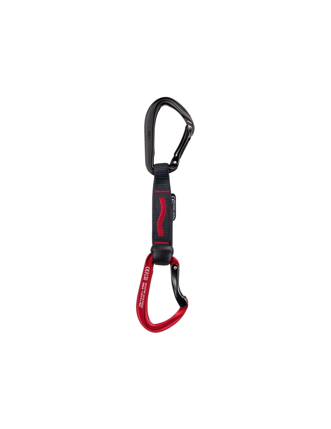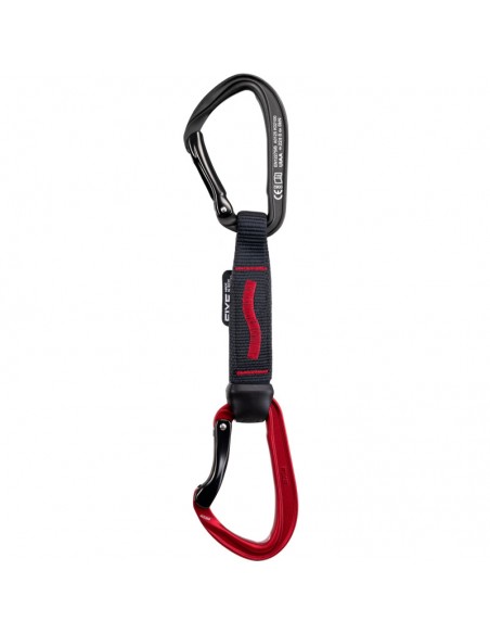 - Goma antigiro asimétrica: La diferencia de tamaño entre los orificios coloca la cinta perfectamente alineada con el mosquetón. El orificio de control permite verificar fácilmente el correcto montaje.