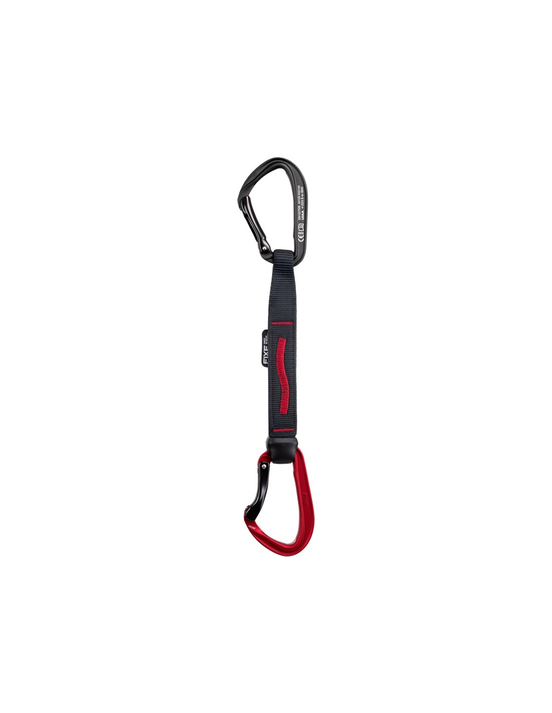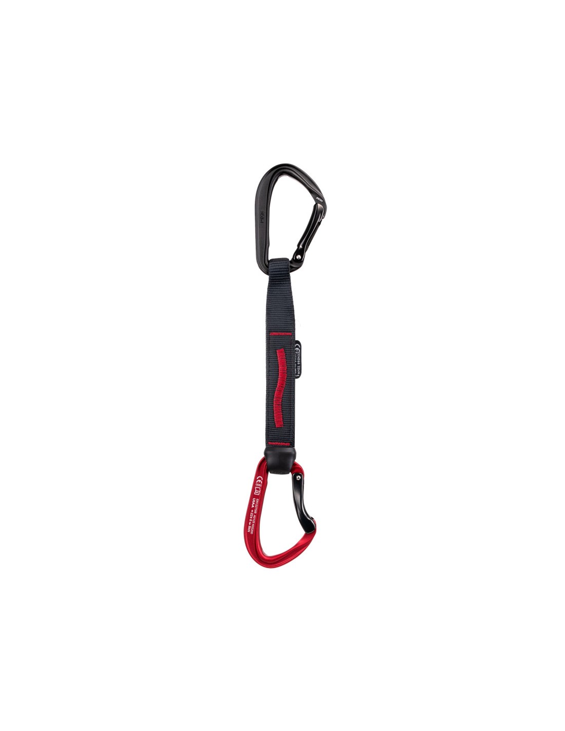 - Goma antigiro asimétrica: La diferencia de tamaño entre los orificios coloca la cinta perfectamente alineada con el mosquetón. El orificio de control permite verificar fácilmente el correcto montaje.
