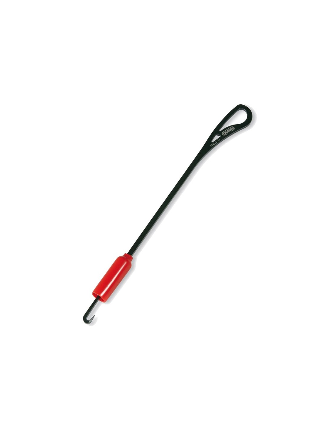 Gancho ligero para enhebrar anclajes Abalakov y quitar hielo del tubo de un tornillo para hielo.