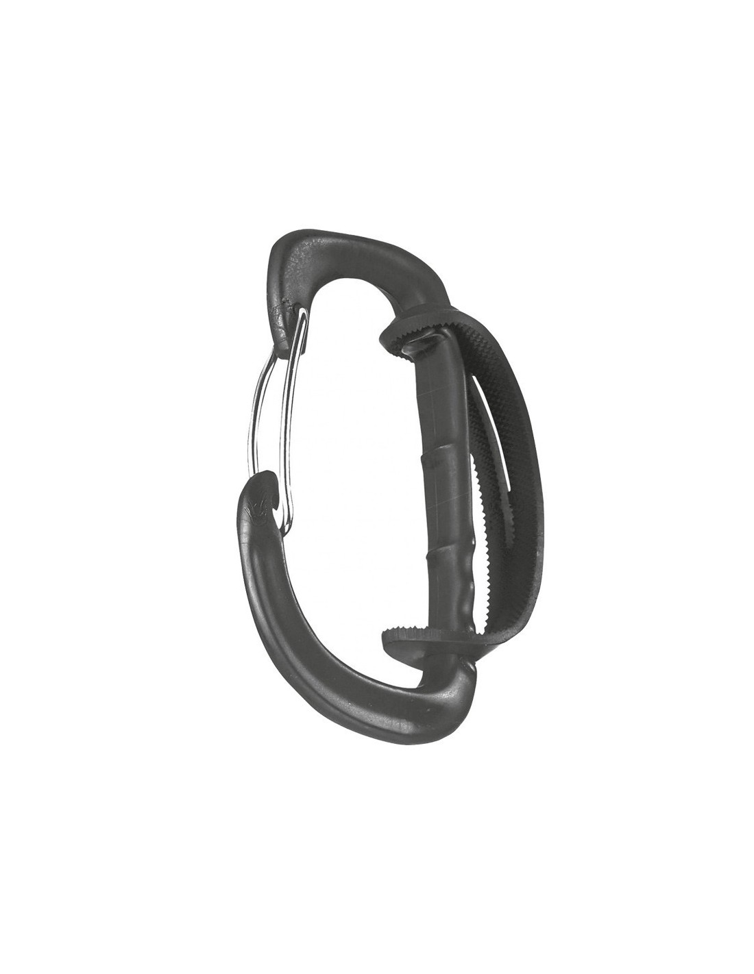 Mosquetón portamaterial con gatillo de alambre con una amplia apertura y una acción suave diseñada para transportar hasta seis tornillos de hielo.