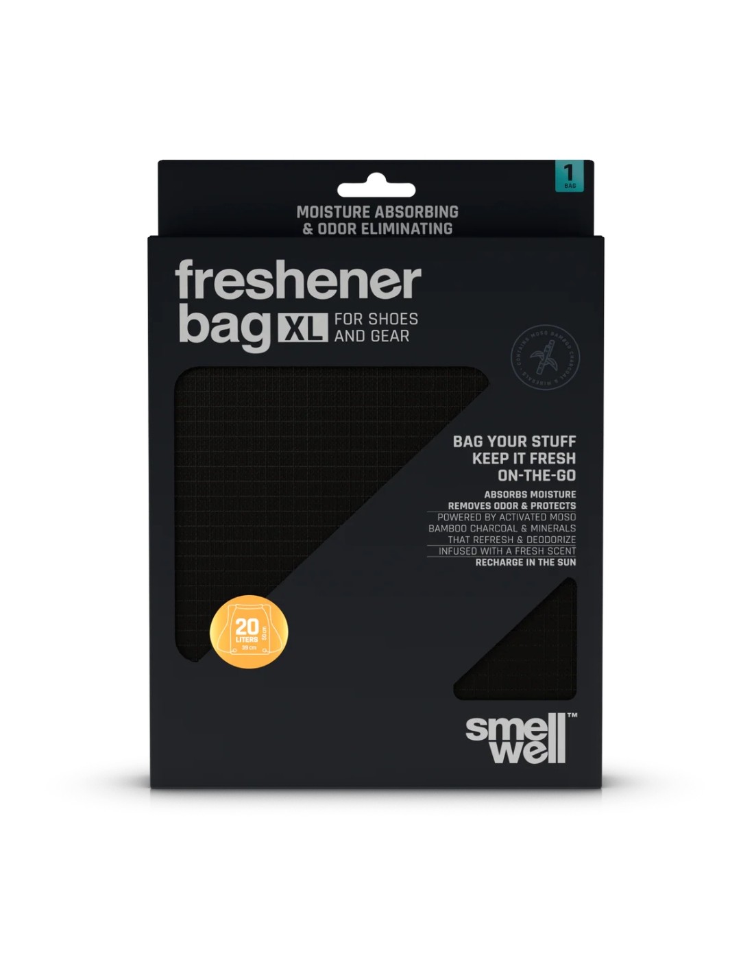 - Membrana SmellWell ™ en el interior que contiene carbón de bambú moso activado microporoso y minerales que deshumidifican y desodorizan tus cosas.