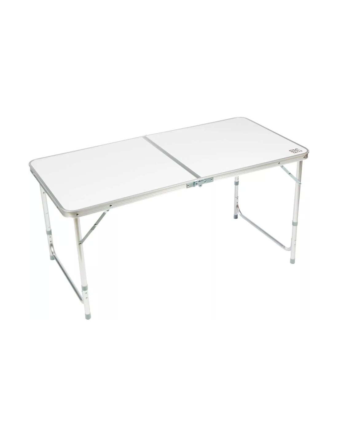 Fabricada con tablero de fibra de madera de alta densidad y estructura de aluminio, cuenta con patas ajustables en altura para adaptarse a terrenos irregulares. Se pliega fácilmente y dispone de asa de transporte integrada para moverla sin esfuerzo.