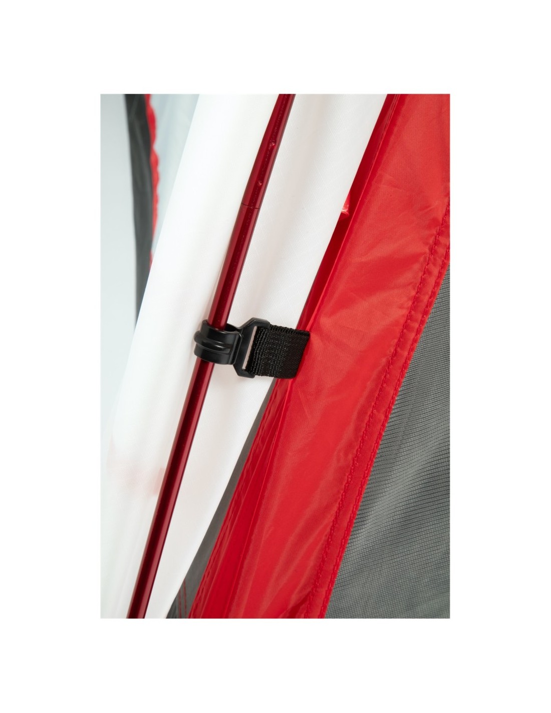 Su estructura de varillas de aluminio proporciona estabilidad, mientras que las dos puertas laterales facilitan el acceso y la ventilación. El doble techo y las ventanas de malla reducen la condensación y mejoran el confort interior.